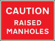 This hazard sign indicates the presence of raised manholes, helping to prevent accidents by alerting individuals to potential tripping hazards on site.