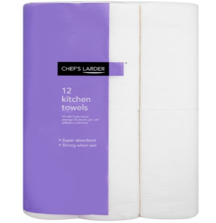 Stock up on reliable, high-quality kitchen towels with Chef's Larder. This pack includes 12 rolls of 2-ply kitchen towels, each featuring 56 sheets. Designed for everyday use, these towels are perfect for handling spills, cleaning surfaces, and more.