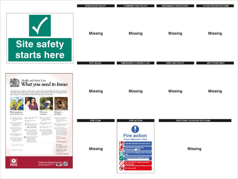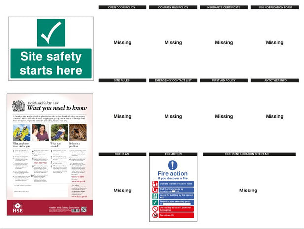 A large internal notice board designed to ensure all employees and visitors are fully aware of site rules and procedures. The board is made from 5mm foam PVC and includes a Health & Safety Law poster along with document holders for key site information. The document pockets are labeled for the following: