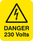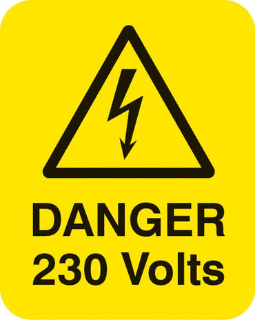 These self-adhesive labels provide clear warnings about 230-volt electrical hazards. Each label is designed to be tough and non-rip, ensuring durability and effective hazard communication.