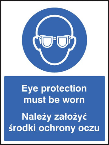 Ensure safety compliance in multilingual environments with the "Eye Protection Must Be Worn" sign, featuring both English and Polish text. This sign effectively communicates essential safety messages to staff and visitors, acknowledging the diverse language needs in the workplace.