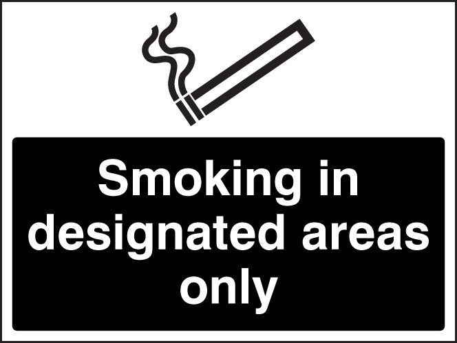 Under BS EN ISO 7010 and BS 5499, as with First Aid signs and Fire Exits, signs relating to Designated Smoking Areas are deemed as Safe Condition signs. These signs should always use white text on a green background, alongside a tick or appropriate symbol. Whilst we actively endorse and, wherever possible, adhere to the relevant Standards, we feel in this specific instance signs permitting smoking should under no circumstance be deemed as ?safe?. In acknowledgement of the damaging affects of smoking, please note our range of signs utilises black to clearly differentiate these signs from Safe Condition signs.