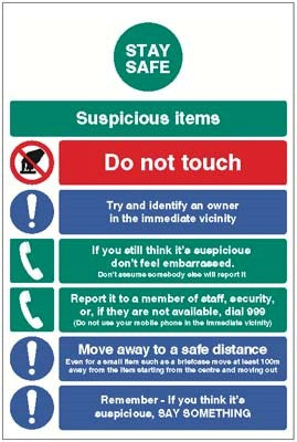 This sign has been designed to educate viewers on the behaviour they should adopt in the event the find a suspicious item or during a terrorist attack. These simple steps could help save lives.
