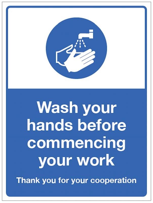 - Purpose: Informs and reminds individuals to wash their hands before starting work to maintain hygiene and safety.